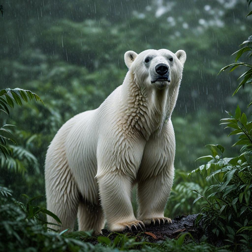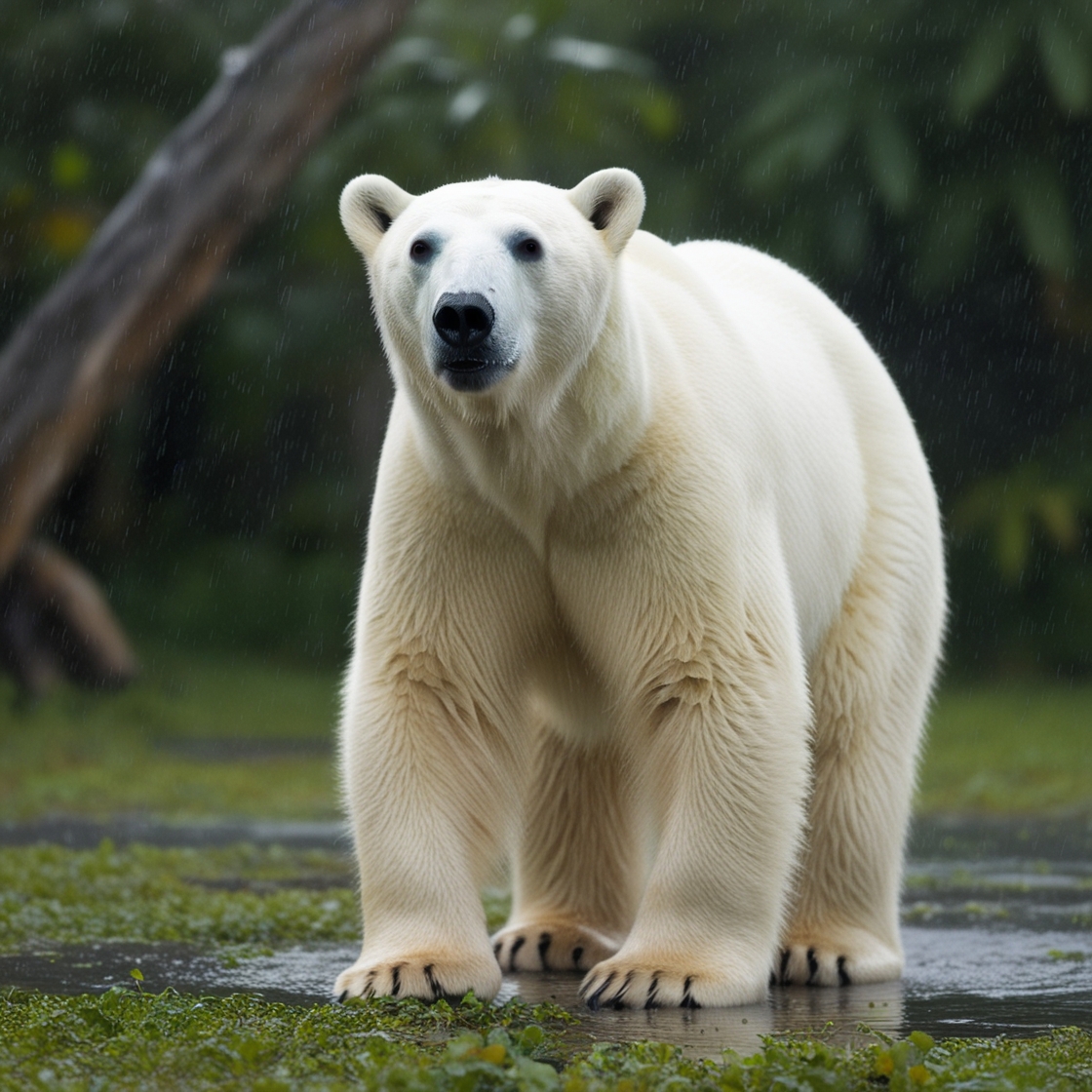 MidJourney, DALL-E 3, and Leonardo were asked to generate an image of “A polar bear standing in a jungle during a rain.”